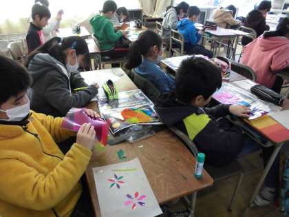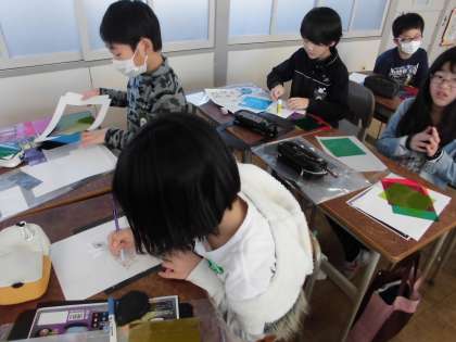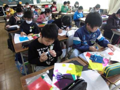 光のハーモニー制作【1月18日(金)の5年生】 公開日 2019/01/18 更新日 2019/01/18 5年 新しい図工の作品制作に取りかかりました。セロハンを切り貼りして、ランプシェードを作っています。どんな作品ができるか楽しみです。