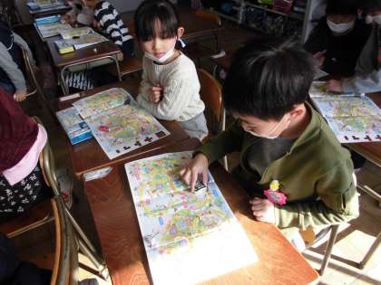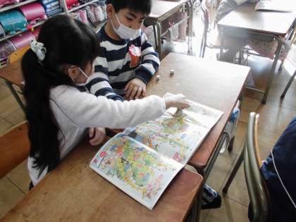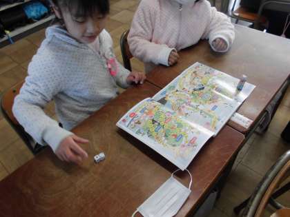 すごろくであそんだよ【1月18日(金)の1年生】 公開日 2019/01/21 更新日 2019/01/21 1年 すごろくを使って遊びました。はじめは、サイコロ1個で、慣れてきたらサイコロ2個の目をたして遊びました。遊びながら100までの数の勉強をしました。