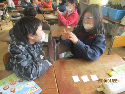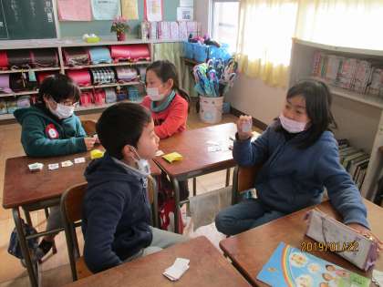 カードを使って、クイズを出し合っています。