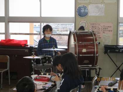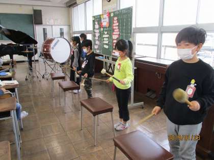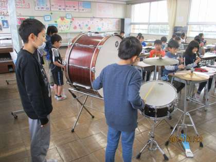 大太鼓やシンバルをリズムよくたたいています。