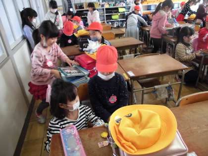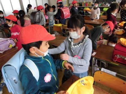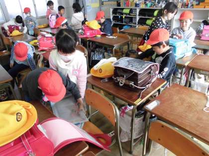 一日入学に向けて その1【2月7日(木)の1年生】 公開日 2019/02/07 更新日 2019/02/07 1年 一日入学の日、新一年生に、荷物の入った思いランドセルを背負ったり、用具の出し入れを体験させてあげたいと、子どもたちから提案がありました。去年、自分たちも教えてもらった経験を活かし、新一年生役と一年生役に分かれて練習をしました。