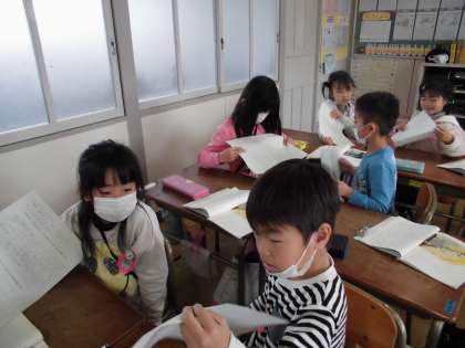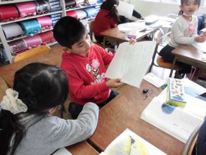 たぬきの糸車 【2月8日(金)の1年生】 公開日 2019/02/10 更新日 2019/02/10 1年 国語で「たぬきの糸車」の学習をしました。たぬきやおかみさんに言ってあげたい言葉を考え、ワークシートに書きました。そのあと、ペアで交流しました。