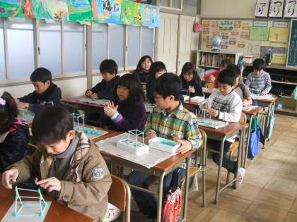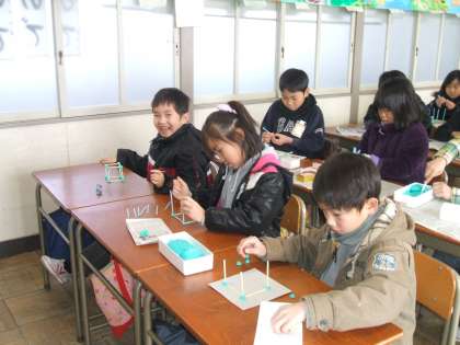 はこの形をしらべよう(算数) 公開日 2010/01/23 更新日 2010/01/22 3年 ストローと粘土を使って、はこの形を作りました。 1つ目は、同じ長さのストローで、2つ目は、2種類の長さのストローで、3つ目は、3種類の長さのストローで、はこの形を作りました。 楽しんで操作する中で、辺や頂点の数、構成を勉強することができました。