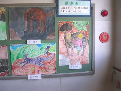 廊下の掲示物 図工の作品 公開日 2010/01/26 更新日 2010/01/26 校長室より 3階の給食コンテナ室のすぐ近くにある掲示板の作品です。4年生が物語を読んで、印象に残った場面を想像して描きました。