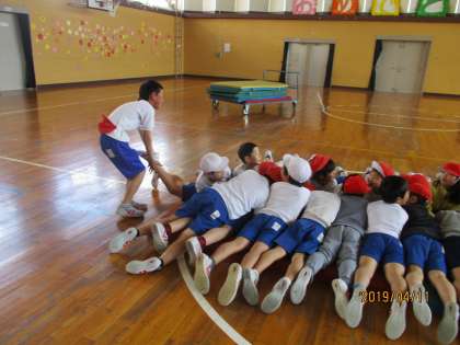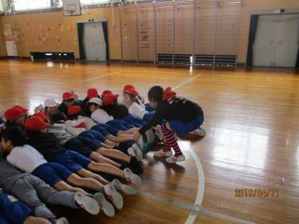 体ほぐしの運動として、「大根抜き」という活動をしました。足を引っ張り、大根のように引き抜いていきます。引かれた人は、力を合わせて抜かれないようにしました。