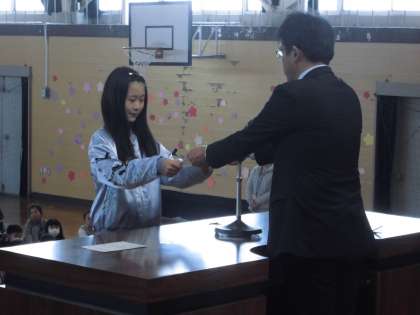 学級委員、学級書記、代表委員の任命式が行われました。 各クラスの代表として、がんばってください。