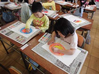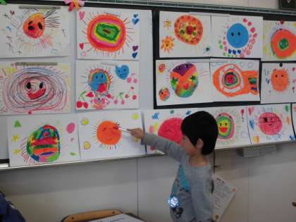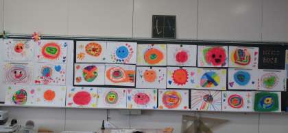 おひさまにこにこ その2【4月18日(木)の1年生】 公開日 2019/04/18 更新日 2019/04/18 1年 図工の時間にクレパスを使っておひさまをかきました。 青空にどんなおひさまを輝かせようかな?想像を膨らませて、楽しい作品がたくさんでき上がりました。 友達の作品のすてきなところを見つけて、発表することもできました。