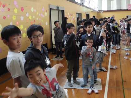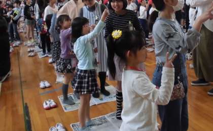 新聞ゲームをし、じゃんけんに負けたら新聞紙を半分に折っていきました。