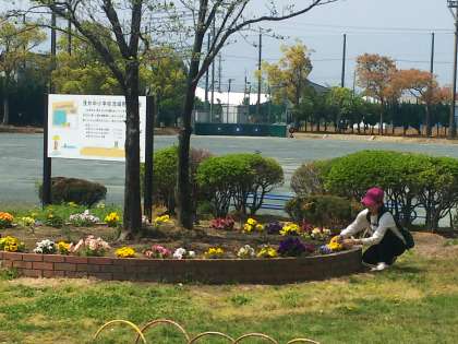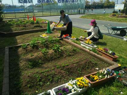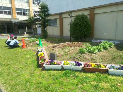 温かい春の陽ざしが差し込む中間放課、園芸サポーターの皆さんに体育館西側の花壇の野菜&草花の手入れをしていただきました。野菜も少しづつ大きくなり、その周りには春の花が満開。草を取ったり、次の花の準備をしたり。だんだん日差しも強くなってきたので、水やりも重要です。園芸サポーターの皆さんんのおかげで、今日も花壇は野菜&花盛りです。