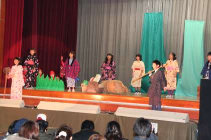 今日は、お忙しい中、学芸会をご観覧くださり、ありがとうございました。校内発表とは違い、お家の方たちがみえるということで子どもたちはかなり緊張していましたが、今までの練習の成果を出し切り、気持ちを合わせて精いっぱい演技をしました。4年生らしい元気いっぱいの劇になったと思います。衣裳や小物の準備など、ご協力ありがとうございました。