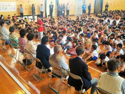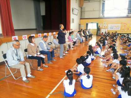 今日は、日頃から児童の登下校の安全を見守っていただいている見守り隊の方との顔合わせの会がありました。各町内の代表児童が、見守っていただいているお礼と今年もお願いしますとあいさつをした後、見守り隊の代表の方からごあいさつをいただきました。