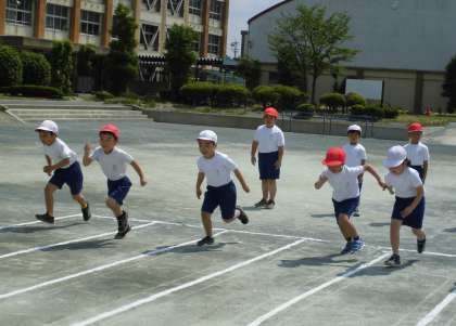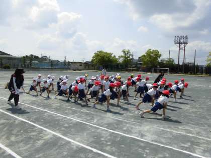 徒競走の並び方を覚えました。準備体操をして、自分のコースを走る練習もしました。