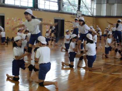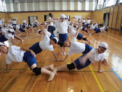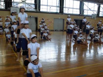 運動会の練習では組み立て体操の技練習をしています!