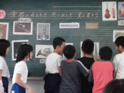 本日の音楽の授業では、リコーダーの練習をしたのちに楽器の名前を憶えているか確認しました。この楽器の名前は・・・?相談しながら確認をしていました。