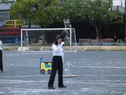 2時間目終了後の放課には、全校児童が運動場に集まって、衝突実験を見ました。