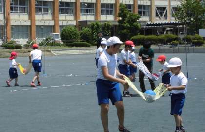 ボールdeワッショイ!! その2【5月21日(火)の1年生】 公開日 2019/05/21 更新日 2019/05/21 1年 手ぬぐいの上にボールをのせ、落とさないようにペアの子と協力して運びました。