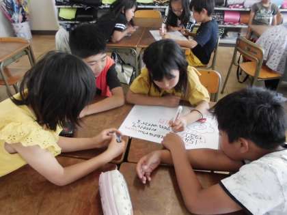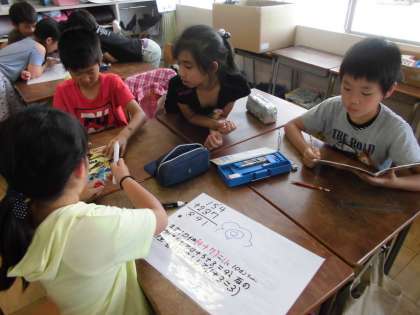 ホワイトボードを使って算数の勉強をしています。グループで考え方をまとめました。