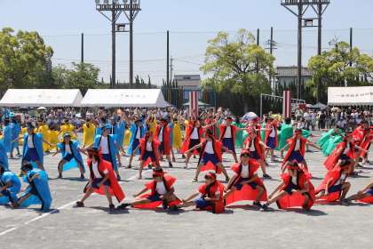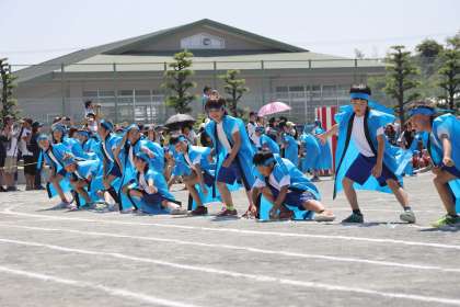 中小ソーラン、色とりどりのハッピを着てかっこよく踊りました。