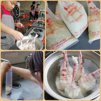 お米は、パッククッキングで炊きました。災害時に使える炊き出し袋を使った調理法です。アレルギー対応ができ、個包装なので衛生面でも安心です。洗い物が出ないので水不足時も助かります。