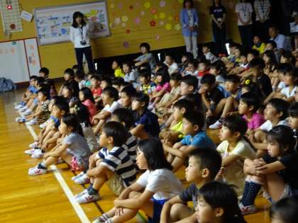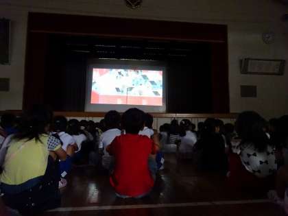 読み聞かせボランティアの方に「かべのむこうになにがある?」というタイトルの読み聞かせをしていただきました。スクリーンを使っての読み聞かせ、どの子もお話の世界に入り込んでいました。