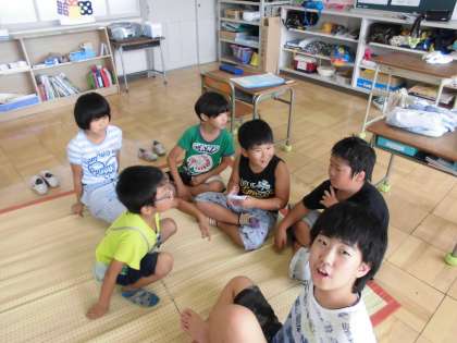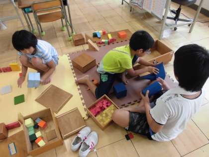 学習を一生懸命取り組んでいます。話し合いながらブロックで町を作りました。