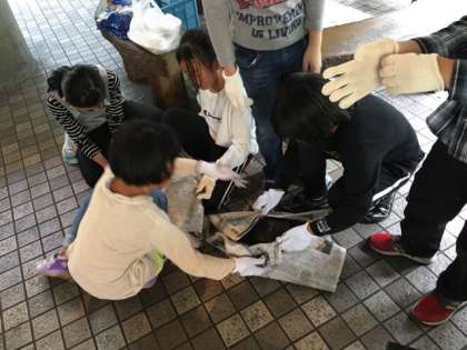 ルゥを入れたり、炊き上がった飯盒のすすを新聞紙でとっています。
