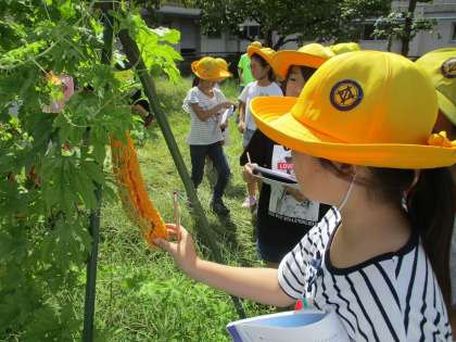 外の学年園で、育てたツルレイシの観察をしました。