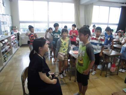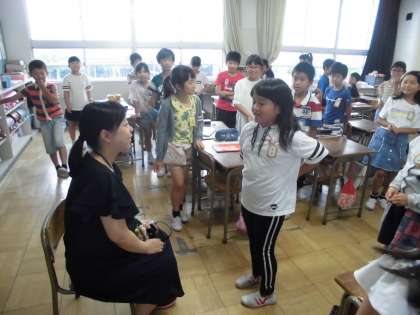 1組の発表を2組の先生が見に来てくれました。余った時間で、先生のほめ言葉のシャワーをしました。