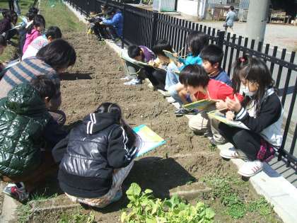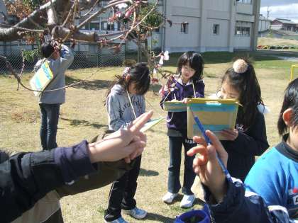生活科の学習で、「春」を探しに、校庭の様子を観察しました。秋に植えたチューリップの球根が芽を出していたり、梅や桜の花が咲き始めていたりと、少しずつ春が近づいていることを実感していました。