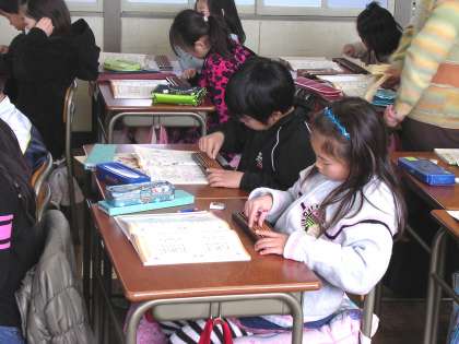 そろばん教室3日目の様子です。引き算のやり方を習っているところです。