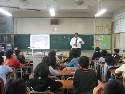 5−2も英語の授業がありました! 公開日 2010/04/21 更新日 2010/04/21 5年 5年2組も英語の授業がありました。ハーロイ先生は背がとても高いので、子ども達の提案で、代表の子が隣に立って背比べをしました。子どもたちは昆虫や動物のことについて質問し、大喜びでした。