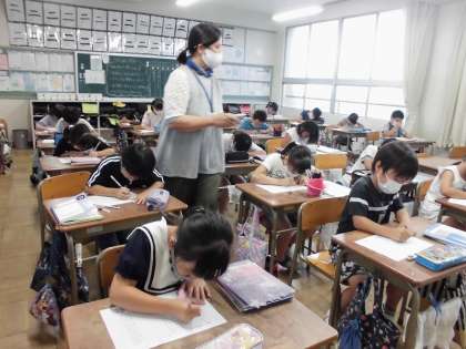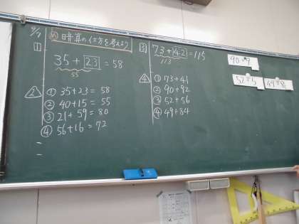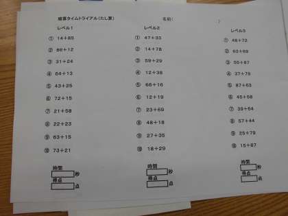 暗算【9月7日(月)の3年生】 公開日 2020/09/07 更新日 2020/09/07 3年 3年1組の1時間目の様子です。 今日は稲川先生と算数の学習をしました。暗算の仕方について考え、授業の最後にはタイムトライアルをしました。目標は10問で1分以内です。何秒でできたかな?