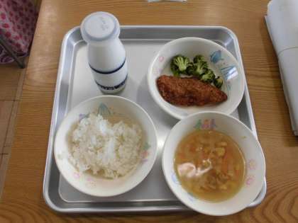 今日のメニューは「ご飯、牛乳、エッグスープ、しいらバジルフライ、ブロッコリーのドレッシングあえ」でした。美味しくいただきました。