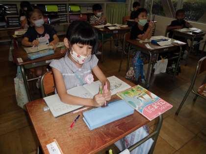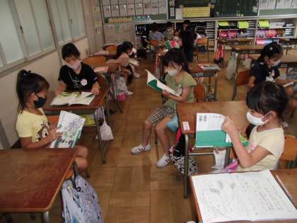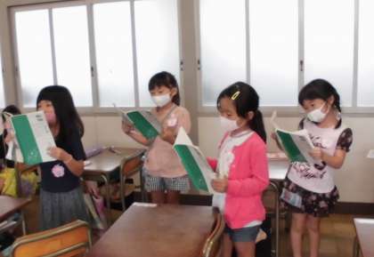 学習の様子 その1【9月8日(月)の1年生】 公開日 2020/09/07 更新日 2020/09/07 1年 算数の「おおきさくらべ」では、鉛筆やひなどの長さの比べ方を考えました。国語では、3匹の青虫と大きな木の役に分かれて、3場面の音読の練習をしました。