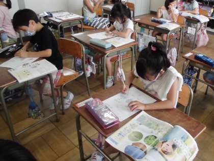 生活科では、あさがおの育ってきた様子を振り返り、1枚にまとめました。