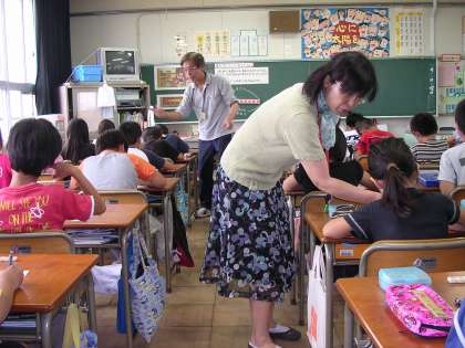 3年生は算数で「線分図を使って立式しよう」を勉強しています。指導は2人の先生で行っています。机間指導など役割分担を決めて能率よくきめ細かい指導に心がけています。