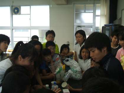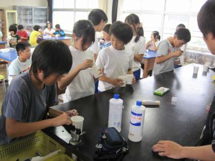 洗濯のりに絵の具を溶かし、ホウ砂の飽和水溶液を加えるだけでスライムに変化することに、みんな驚いていました。スライムに塩をかけると水分が出て、硬くなるということも学びました。