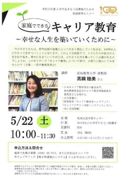 「小中学生をもつ保護者のための家庭教育セミナー」について【4月24日(土) 募集】