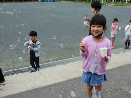 写生会で「しゃぼん玉あそび」の絵を描きます。しゃぼん玉あそびを体感しました楽しさを表現します!
