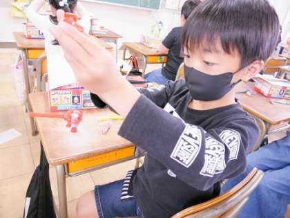 電池のはたらき【5月12日(水) 4年生】 公開日 2021/05/12 更新日 2021/05/12 4年 理科の実験では、モーターを使って プロペラをまわしてみました。 細かい作業でしたががんばりました。 上手く回ったときは、とてもうれしそうでした。