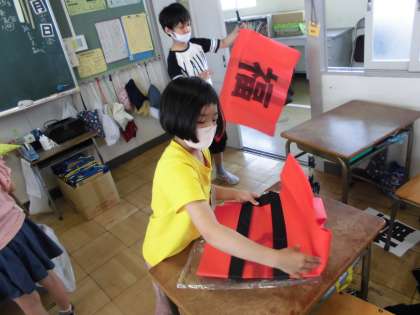 体育発表会のソーラン節で使うハッピの背中に、自分で選んだ漢字を書きました。
