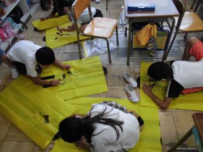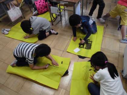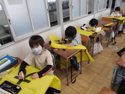 ソーラン節で使うハッピを完成させました。 試着してみると、みんなとてもかっこよかったです。