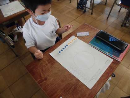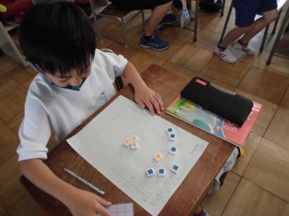 10個のブロックを丸の中に入った数と入らなかった数で色分けし、10はいくつといくつになるかを調べました。