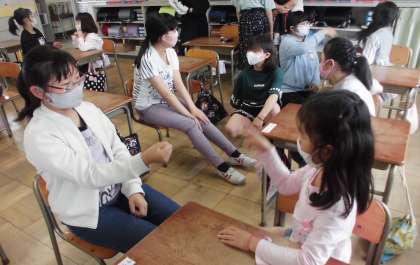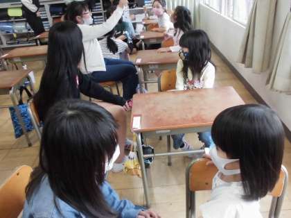じゃんけんのあと、「あっち向いて、ホイ」をやったり、お話をしたりしました。ペアのお姉さんが教室へ戻るときは、もっと一緒にいたいと甘えている子もいました。