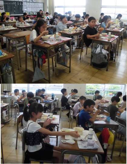給食は、静の時間です。全員前を向いて黙々と食べて います。