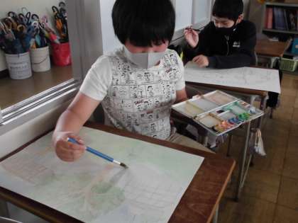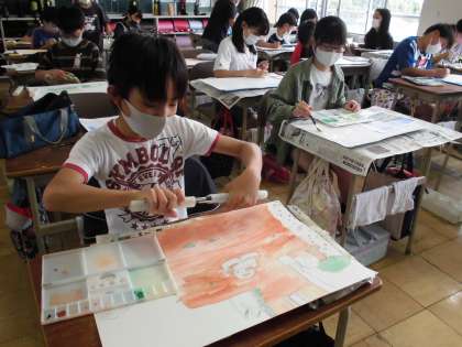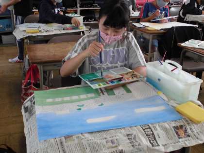 絵の具を使って、絵を描いています。