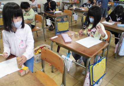 積み木を使って、四角や三角、丸の形をうつして、絵をかきました。