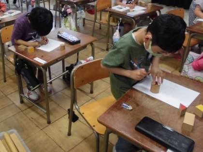 うつした形が、果物や乗り物などの楽しい絵になりました。