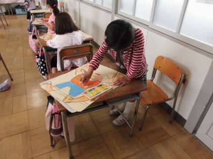 学校で楽しかったことを絵にかきました。顔や服の色などをていねいにぬりました。