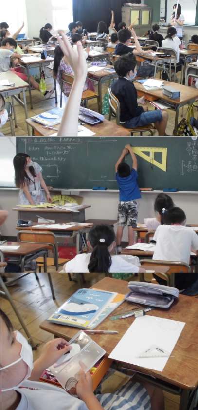 真っ白な紙に、どうやって長方形をかいたのかを確認しています。